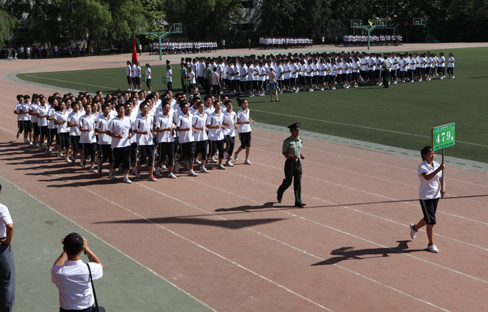 在简单的见面仪式后,22个整齐的方阵在操场列队完毕,来自英雄连队66393部队的教官带领学生马上开始了为期六天的军训生活。